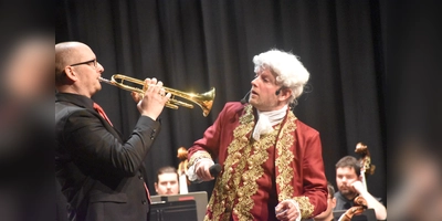 Die Augen der Kinder verfolgten den komisch gekleideten Mann zur Bühne, der sich als Komponist Josef Haydn ausgab und die Kinder zur Mithilfe für beim Komponieren seines neuen Menuettes aufforderte. Der Musikvermittler der Nordwestdeutschen Philharmonie, Johannes Hofmann spielte als Haydn Darsteller interaktiv mit den Musikern des Orchesters und den Kindern die begeistert mitmachten und erlebten, wie aufregend klassische Musik sein kann.