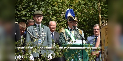 Schon beim Festakt auf dem Sportplatz bot sich ein eindrucksvolles Bild mit 33 Gruppen der Schützenbruderschaften und 11 Musikkapellen. Die Ehrengäste auf der Tribüne hatten den besten Blick auf das Geschehen. Oberst Matthias Sonntag musst den Festakt mit einer Schweigeminute für den am Tag zuvor plötzlich verstorbenen Schützenbruder Michael Sander beginnen. Er begrüßte und dankte seinen Schützenbrüdern und allen Helfern für Organisation und übergab das Wort an die Festredner. Bezirksbundesmeister Stefan Rüther dankte für die Gastfreundschaft der Schützenbrüder aus Dalhausen und betonte in seiner Rede die Kraft der Tradition, die Generationen verbindet.