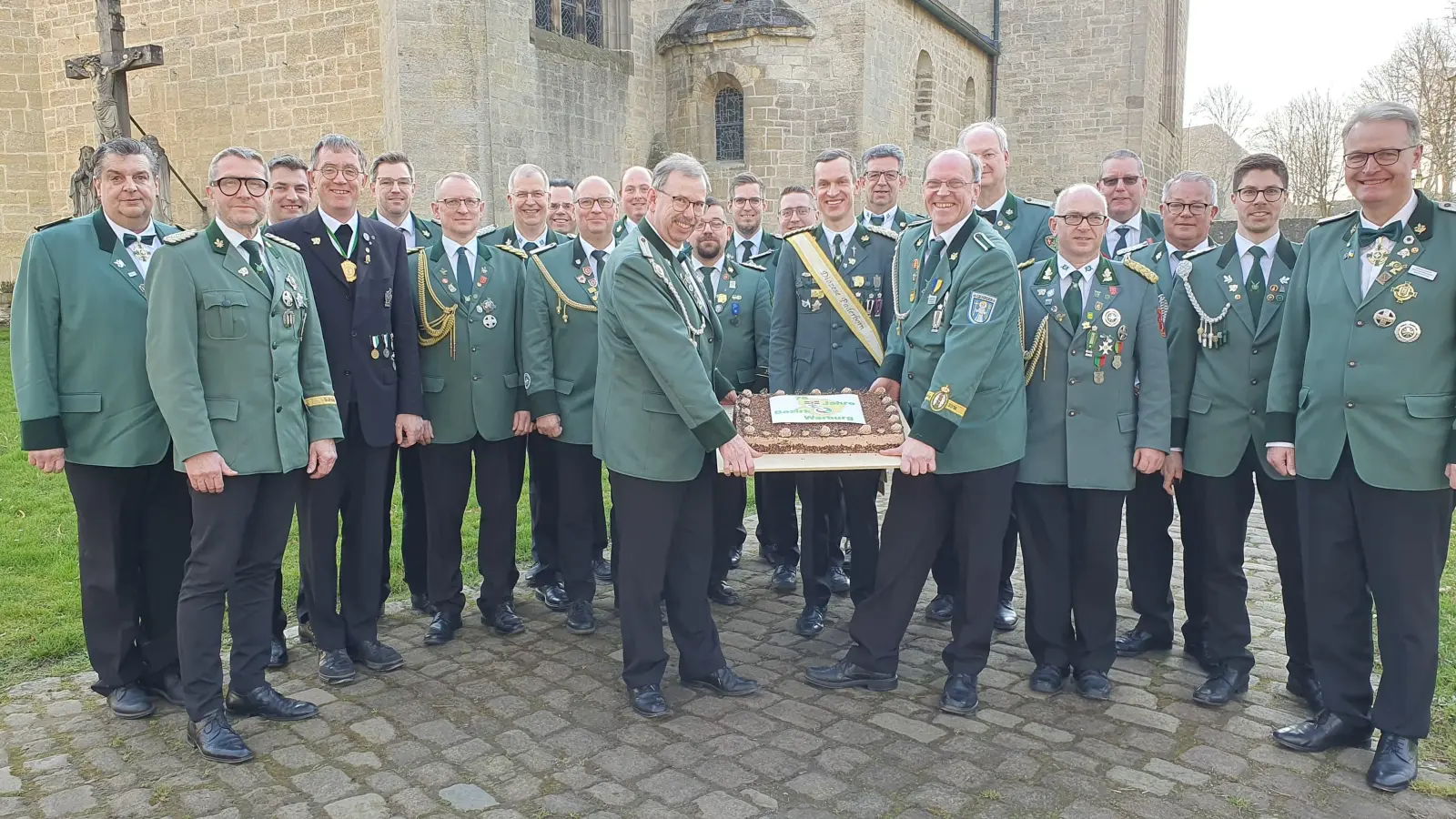 Vor kurzem traf sich der Bezirksvorstand und Vertreter der 13 Bruderschaften des Bezirksverbandes Warburg im Bund der Historischen Deutschen Schützenbruderschaften zum Tagesseminar in Gehrden. Es gibt allen Grund zu feiern, denn den Bezirksverband gibt es nun seit 75 Jahren. Zum Auftakt des Jubiläumsjahres gab es für die Teilnehmer eine standesgemäße Torte aus den Händen des stellvertretenden Bezirksbundesmeisters und Bäckermeisters Reinhard Pape.