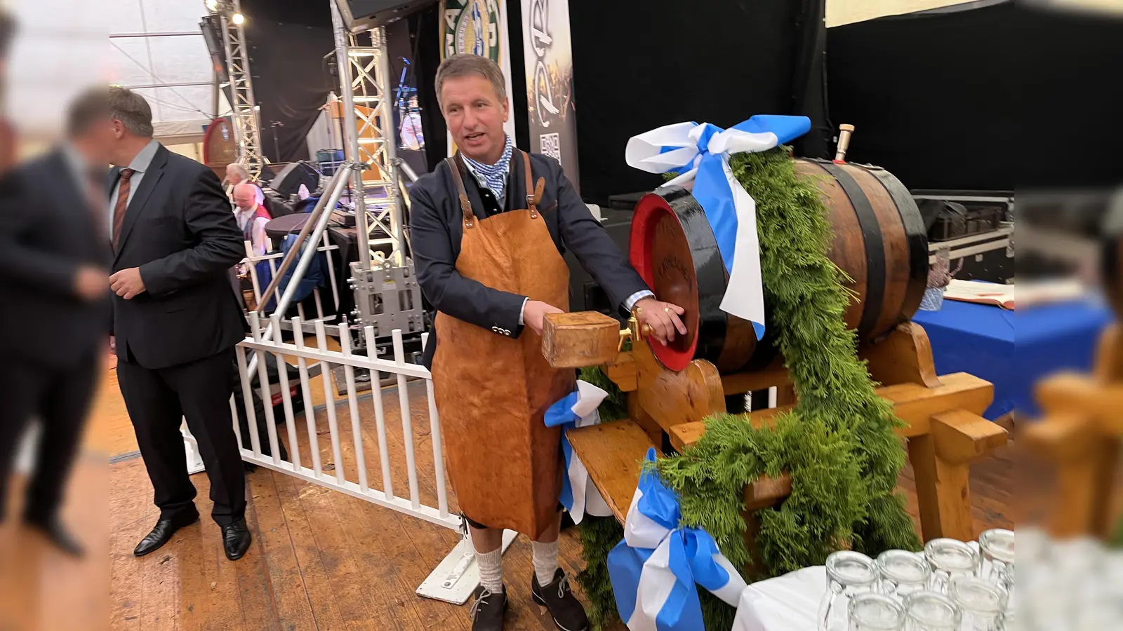 Als Bürgermeister hat Stickeln dem Anschlagen des Bierfasses nur zugeschaut, nun musste er als Schirmherr selbst zum Hammer greifen. Mit einem gezielten Schlag war die Aufgabe schon erfüllt und das Urtyp konnte fliessen.