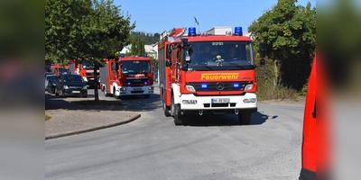 Unter den Augen des Bürgermeisters Hubertus Grimm, des Kreisbrandmeisters Stefan Nostitz und des Stadtbrandmeisters Sebastian Ewen rückte die stattliche Kolonne mit Blaulicht auf dem großen Areal mit Kiesseen ein.