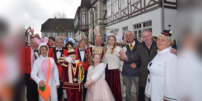 Der Wettergott ist den Narren von Brakel Radau offensichtlich wohlgesonnen, denn sonnig wurde es in der Tat, pünktlich zum offiziellen Helau beim Sturm auf das Rathaus. Prinz Hermann I. und Prinzessin Eva I. sowie das Kinderkönigspaar Henri I. und Pauline I. rückten mit närrischem Aufmarsch an. Ihr Begehr – nebst einer großen Portion Singen, Lachen und Schunkeln – war der goldene Schlüssel der ehrenwerten Verwaltung, und ihnen im Weg standen Robert Rissing und Peter Frischemeier, treue Vertreter des Bürgermeisters Hermann Temme, der sich entschuldigen ließ. Vielleicht ahnend, dass die Karnevalisten auch diesmal wieder siegreich sein würden in ihrer Rathauseroberung? Man kann sich nur auf Gerüchte stützen.