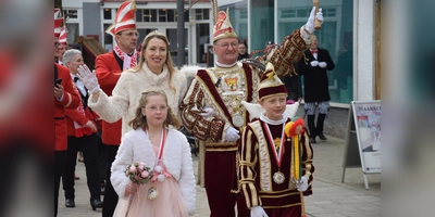 Der Wettergott ist den Narren von Brakel Radau offensichtlich wohlgesonnen, denn sonnig wurde es in der Tat, pünktlich zum offiziellen Helau beim Sturm auf das Rathaus. Prinz Hermann I. und Prinzessin Eva I. sowie das Kinderkönigspaar Henri I. und Pauline I. rückten mit närrischem Aufmarsch an. Ihr Begehr – nebst einer großen Portion Singen, Lachen und Schunkeln – war der goldene Schlüssel der ehrenwerten Verwaltung, und ihnen im Weg standen Robert Rissing und Peter Frischemeier, treue Vertreter des Bürgermeisters Hermann Temme, der sich entschuldigen ließ. Vielleicht ahnend, dass die Karnevalisten auch diesmal wieder siegreich sein würden in ihrer Rathauseroberung? Man kann sich nur auf Gerüchte stützen.