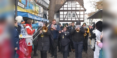 Erstmals wurde eine CVWB-Prinzessin vor aller Augen auf dem Kellerplatz gewogen. Am Rosenmontag erwarteten schon viele Beverunger das traditionelle Aufwiegen der Prinzessin in Süßigkeiten. Vor der Corona-Pandemie waren die Tollitäten mit Gefolge zum Auswiegen der Prinzessin immer Gast in der engen Schalterhalle der Sparkasse. In diesem Jahr war der Kellerplatz vor dem Rathaus mit einer, von der Sparkasse gesponserten Bühne und mit Getränke- und Imbissständen ausgestattet. Mit großem, blau-weißem Gefolge zogen die beiden Prinzenpaare ein. Sitzungspräsidentin Emily Buxton begrüßte die Anwesenden, dankte den Sponsoren und übergab sofort an die Vertreter der Sparkasse. Die Banker kündigten in ihren Reden an, mit den Kamelle-Säcken nicht knauserig zu sein und wenn nötig auf Seiten der Prinzessin mit Eigengewicht auszuhelfen, sollte sie zu leicht sein. Prinzessin Susanne die Kassierende setzte sich auf dem unbequemen Sitz der Balkenwaage und blickte erwartungsfroh und ein wenig ängstlich auf die dicht gedrängte Menge der Zuschauer. Kamellesack um Kamellesack fanden Platz in der Waagschale, aber die zierliche Dame schwebte nicht in die Höhe. Erst als fast alle Säcke schon gestapelt waren, wurde die Prinzessin nach oben gezogen. Mit Jubel und Schunkelrunden feierten die Jecken Kamelle-Berg und Sponsoren.