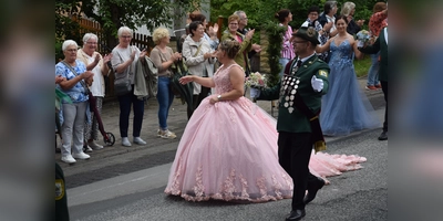 Den prächtigsten Blickfang aber boten, selbstredend, König und Königin des Heimat- und Schützenvereins Ovenhausen. Thomas und Silvia Hesse führten den Festumzug an. Mit ihnen zusammen feierten Gäste und Einheimische gemeinsam rauschende Feste, übers ganze Wochenende. Da gabs keine schlechte Stimmung, da gabs kein mieses Wetter, nur beste Laune und dann und wann mal Regenschirme.